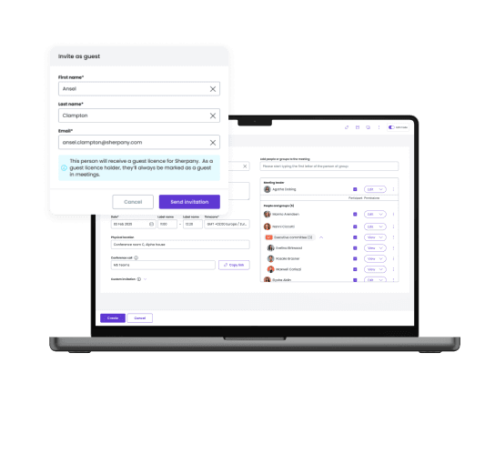 Avec la fonctionnalité des participants externes de Sherpany, il est facile d'inviter et de gérer les participants externes. Si des changements sont apportés à une réunion, les calendriers des participants externes sont automatiquement mis à jour, ce qui élimine la gestion inutile de tout changement. De plus, vous gardez un contrôle total sur leur accès au contenu de la réunion, ce qui garantit une collaboration sûre et efficace avec tous les participants, qu'ils fassent ou non partie de votre organisation.